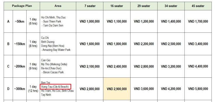 Example: For a day trip to Vung Tau using a 16-seater for 13 hours (8:00 AM – 9:00 PM)
